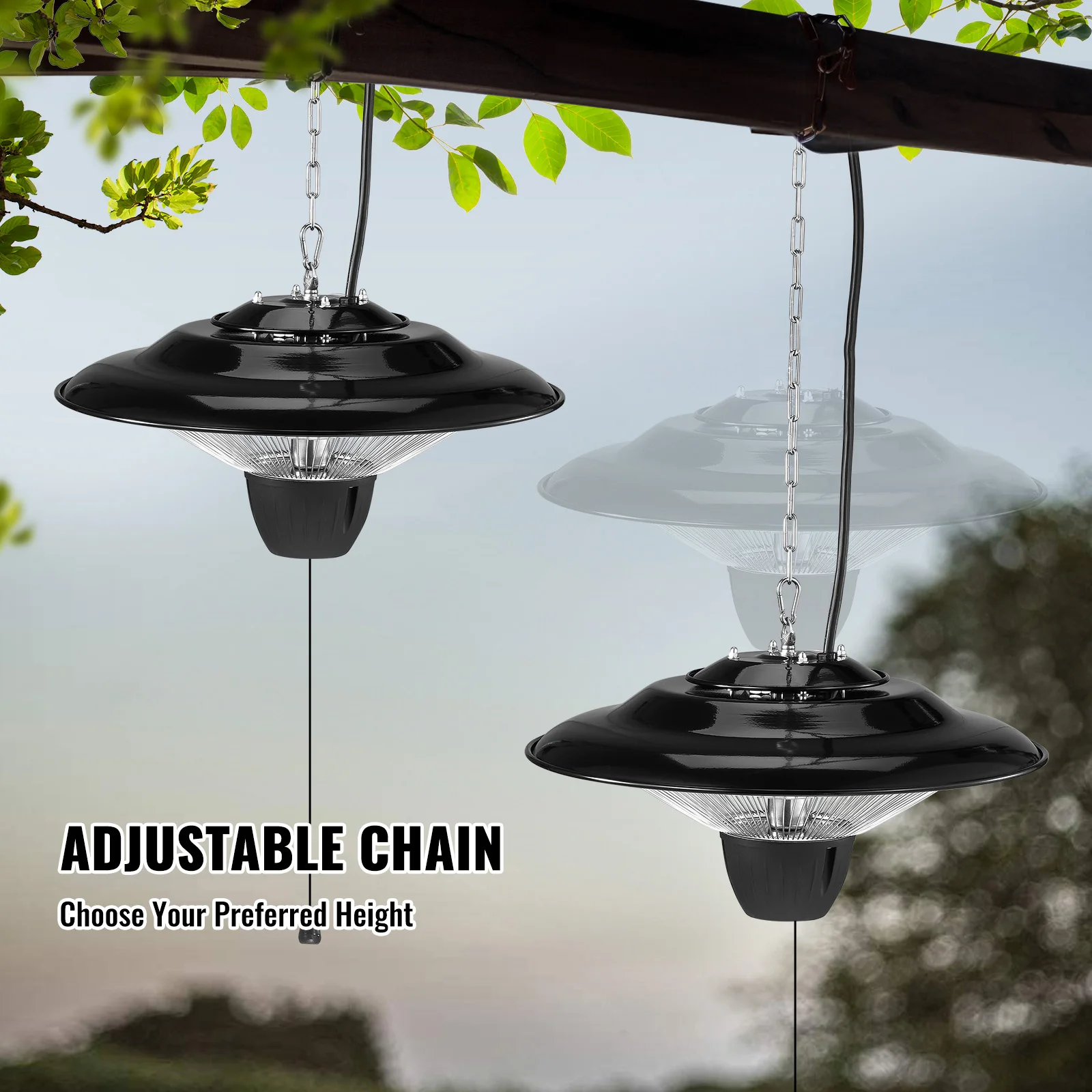 Height Adjustable: Comes with an adjustable chain, allowing you to set the heater’s height as needed. The distance between the bottom of the heater and the ground must be over 1.8m (71″), and at least 30cm (12″) from the ceiling.