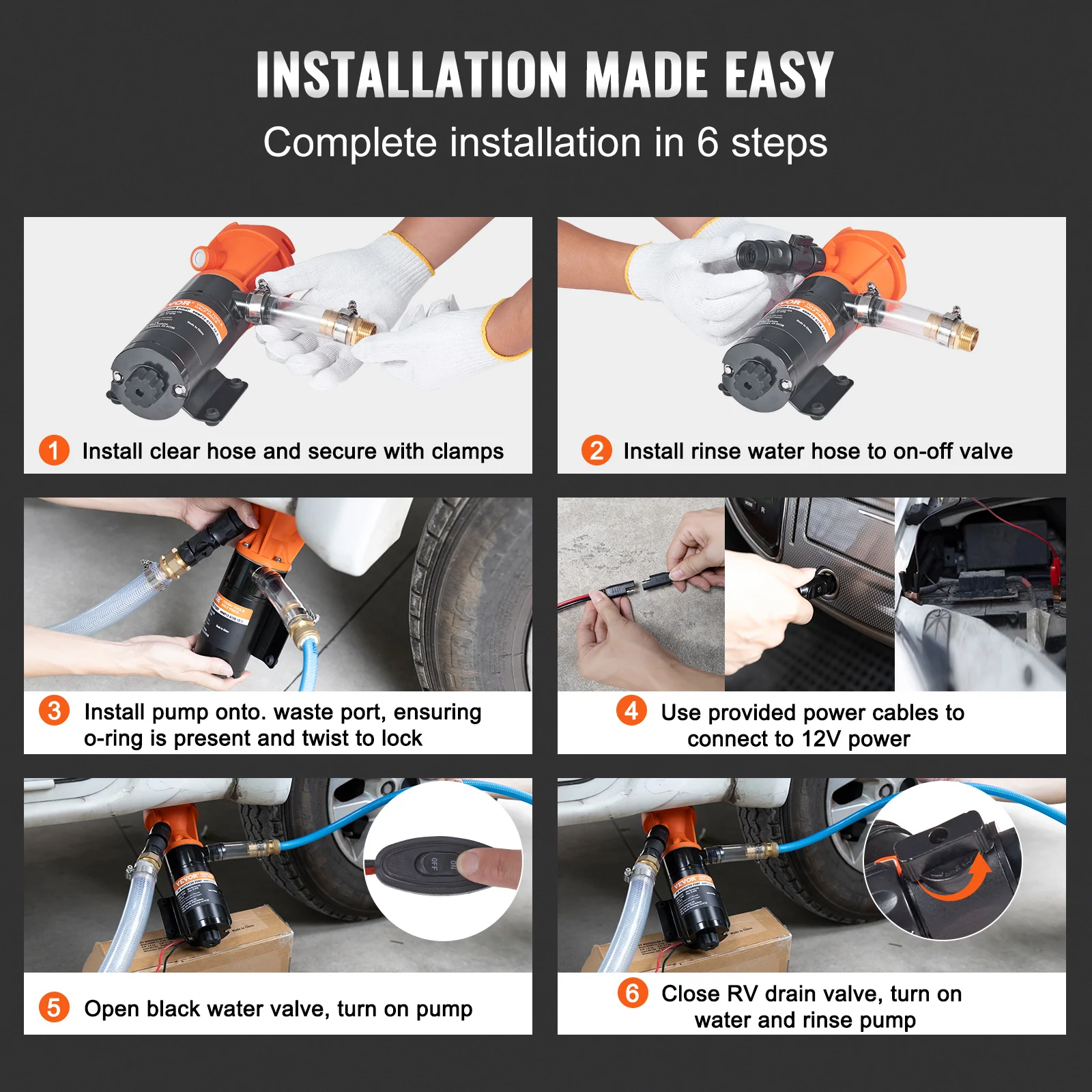 The VEVOR RV macerator pump boasts a 10 ft/ 3 m lift, capable of emptying a 150L black water tank in just 5 minutes. Equipped with the dual four-blade impeller and powerful motor, it effortlessly pulverizes solid debris for easy disposal, ideal for draining RV black water tanks, etc.